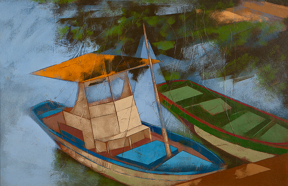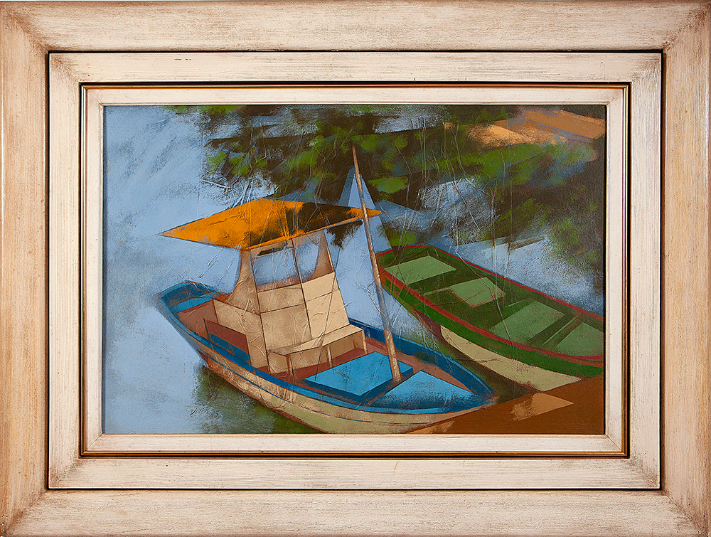 Vinil colado e encerado s/ tela montado em madeira, 65 x 100 cm, ass. inferior esquerdo e verso, dat. 1983